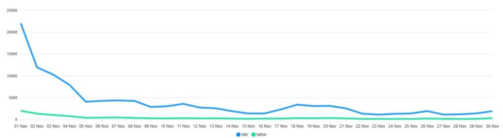 Grafik day-to-day conversation memperlihatkan tren percakapan yang menurun tajam di awal bulan dari level lebih dari 20 ribu unggahan per hari pada 1 November sebelum akhirnya bergerak stabil di kisaran 1.000–4.000 unggahan hingga akhir bulan.