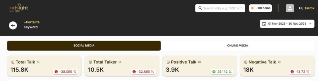 Dashboard IndSight menampilkan dinamika percakapan publik mengenai isu “Pertalite” sepanjang 1–30 November 2025. Data menunjukkan total percakapan di media sosial mencapai 115,817 ribu unggahan, namun angka ini turun cukup signifikan, yakni -38,09% dibanding periode sebelumnya. Penurunan serupa juga terjadi pada jumlah warganet yang terlibat (Total Talker) yang tercatat 10,543 ribu akun, atau menurun -32,86%.