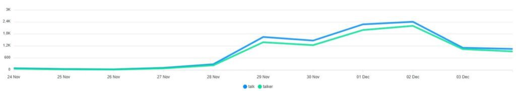 Setelah mencapai puncak pada 2 Desember, percakapan menurun pada 3 dan 4 Desember. Meski demikian, angka talk dan talker tetap lebih tinggi dibanding awal periode pemantauan. Hal ini menunjukkan bahwa film ini masih menjadi bahan obrolan hangat, terutama menjelang penayangan resmi di bioskop.